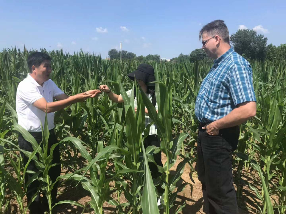 图为刘树堂教授与美国密苏里大学Phillip教授田间交流