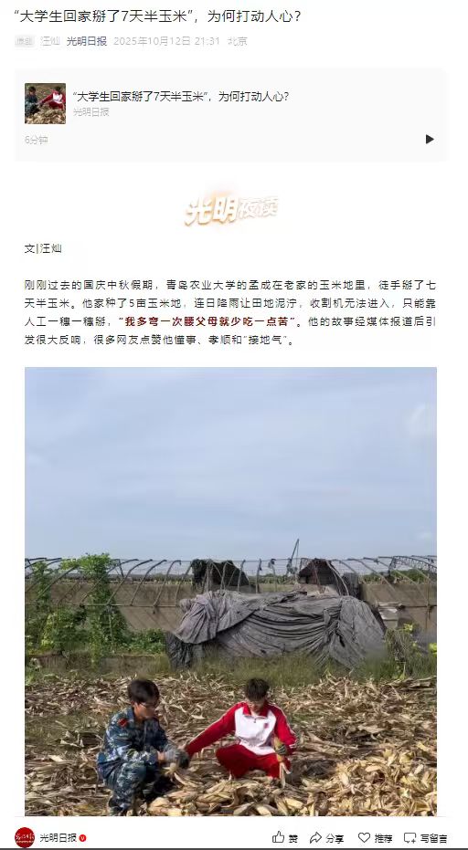 在点赞孟成之后,我们也应思考:如何让这样的“看见”不再是偶然的新闻热点,而转化为社会共同意识?或许,教育的价值不仅在于培养脱离土地的人才,更在于塑造能够理解土地、反哺乡土的心灵;社会发展的目标,不应是割裂人与土地的联结,而是要在现代化进程中保留对土地的温情与敬意。