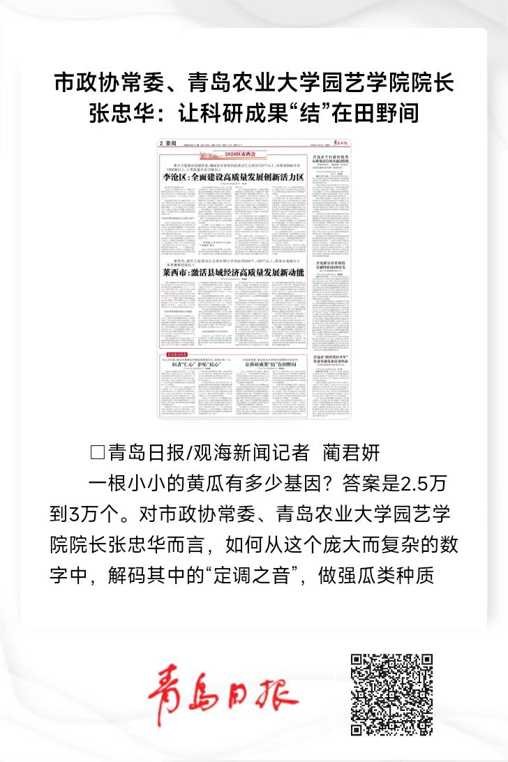 【编者按】1月13日,《青岛日报》以《市政协常委、安博网页版园艺学院院长张忠华:让科研成果“结”在田野间》为题,报道了安博网页版张忠华做强瓜类种质芯片,为瓜类的基因表达和育种调控提供关键信息。