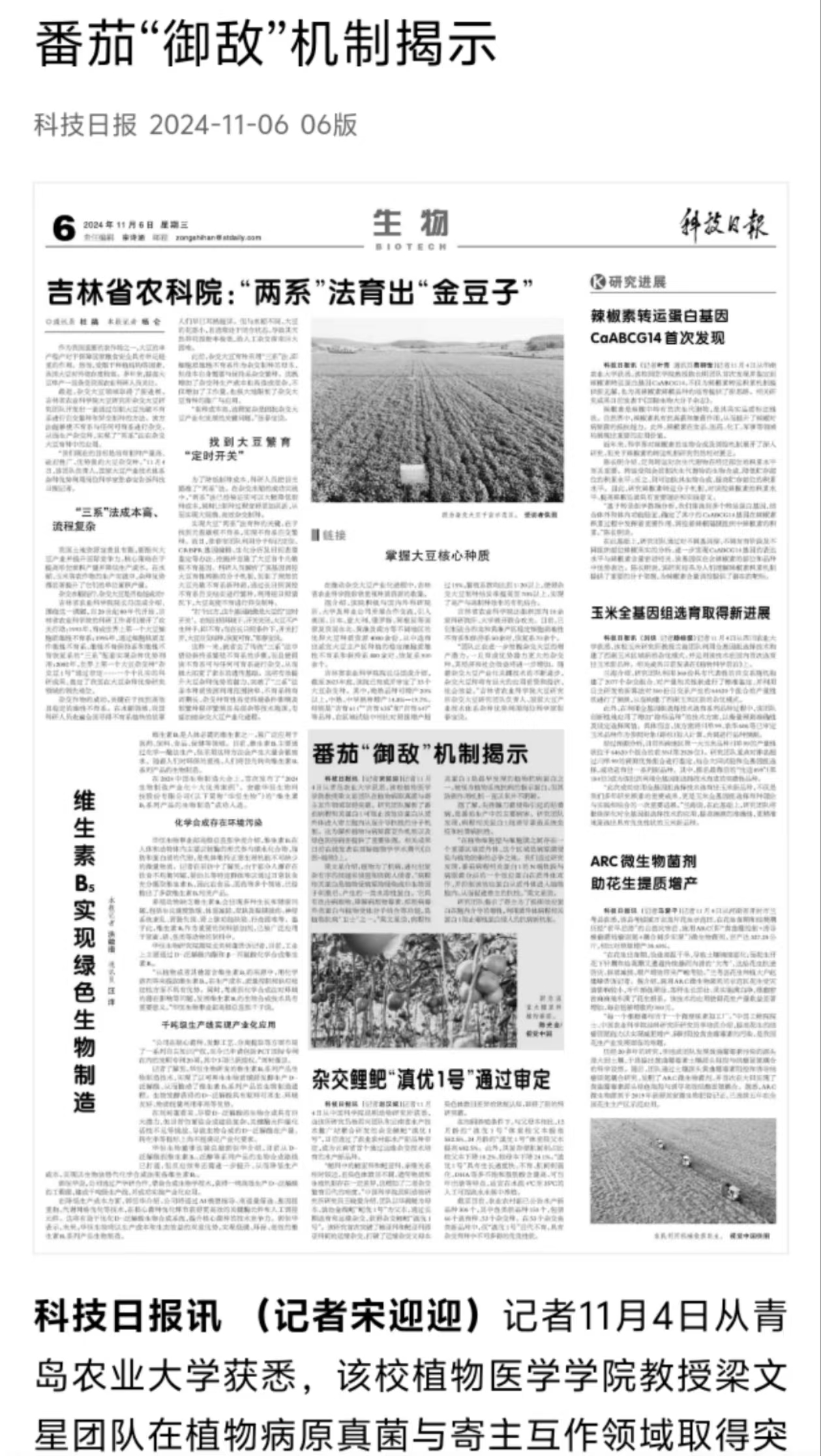 【编者按】11月6日,科技日报通过《番茄“御敌”机制揭示》报道了安博网页版校植物医学学院教授梁文星团队在植物病原真菌与寄主互作领域取得突破。
