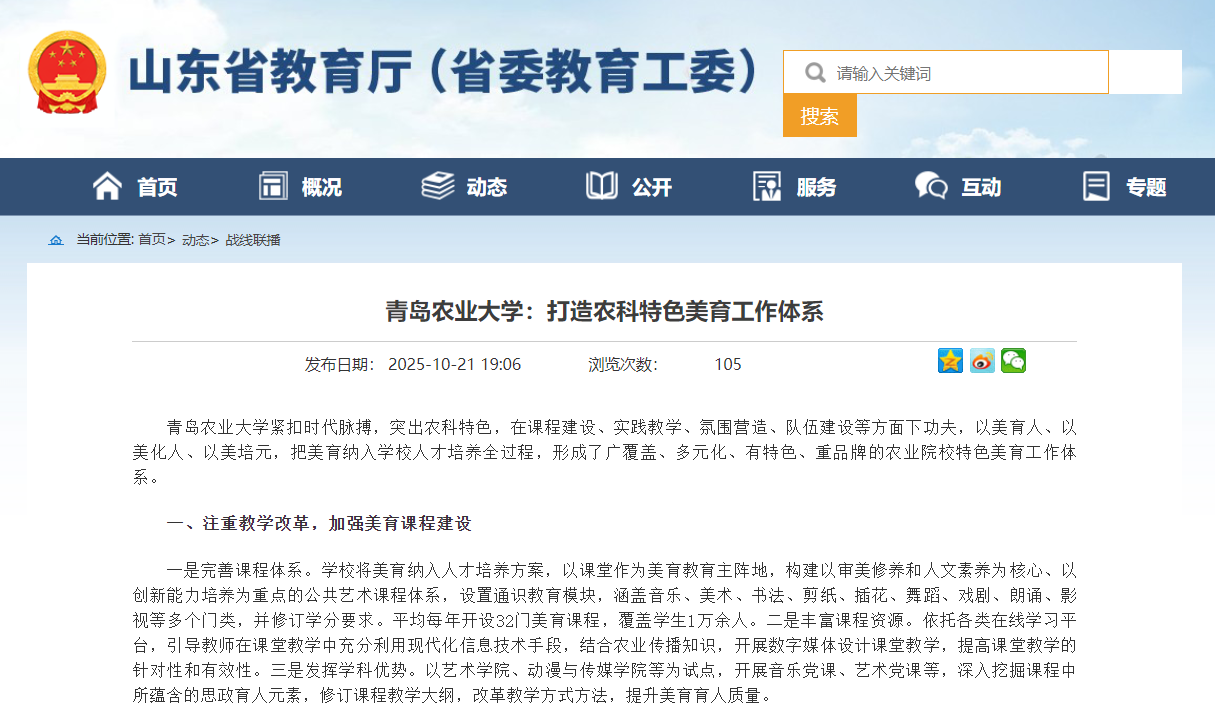 山东省教育厅网站“战线联播”栏目报道安博网页版建设农业院校特色美育工作体系的典型经验。