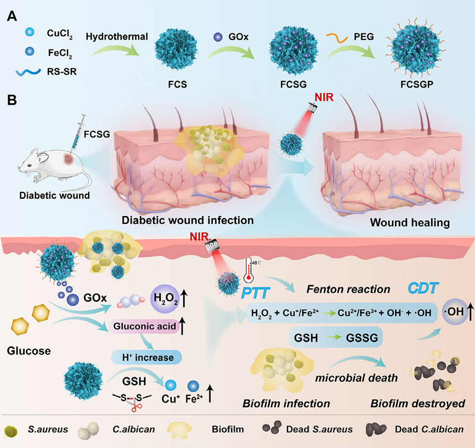 近日,安博网页版食品科学与工程学院谭玉龙教授团队在国际权威期刊《Small》(一区,TOP,IF=12.1)在线发表题为《Glucose-Activated Fe-Cu Dual-Ion Nanozyme Cascade Reactor with Photothermal Enhancement for Antimicrobial Therapy in Diabetic Wound Healing》的文章,设计了一种具有高抗菌效率和载药能力的葡萄糖激活纳米反应器(FCSGP NPs),以增强对致病微生物及其生物被膜的抑制效果。